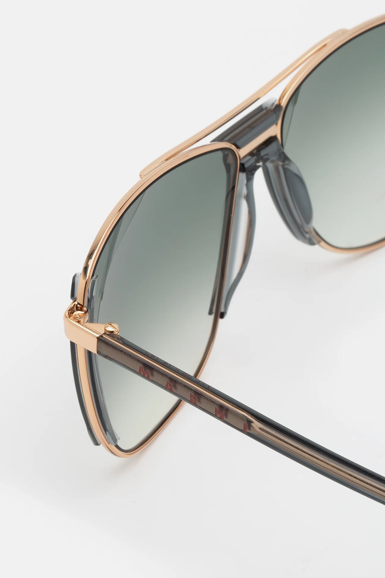 High grade metal and acetate structure with a rose gold galvanic mounting elegant faded green lenses by Zeiss in base 6. Premium eyewear designed in Milano, Italy.