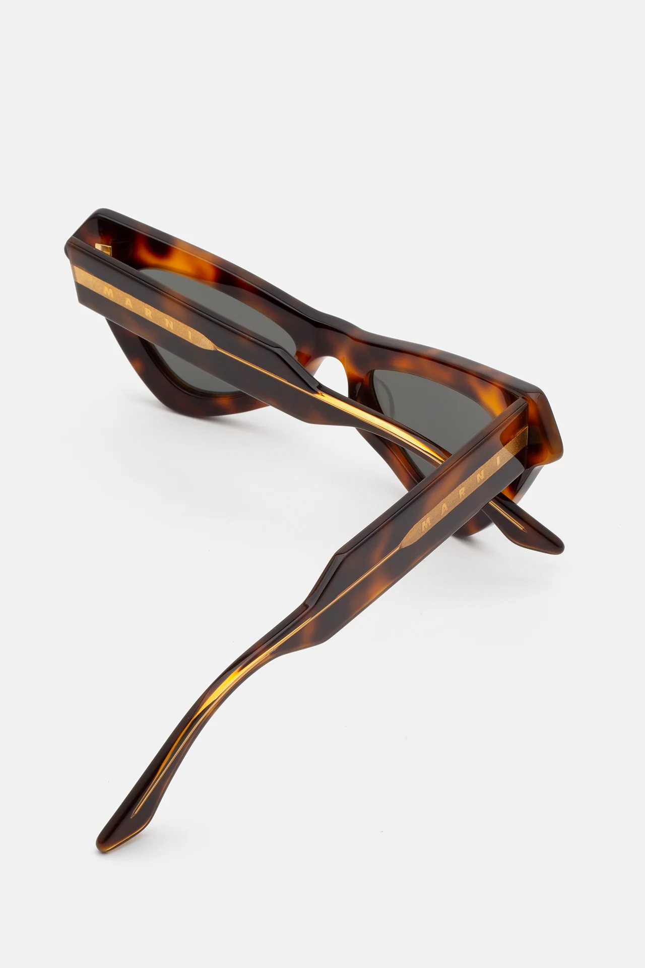 Designed exclusively for Marni, Fairy Pools is an iconic shape created as a bold geometric interpretation of classic cat-eye frames. The model’s recognisable silhouette features sharp, pointed rims encasing triangular lenses. A sturdy nose-bridge and thick temples complete the unique geometry of the piece. This version comes in dark Havana acetate with black lenses.